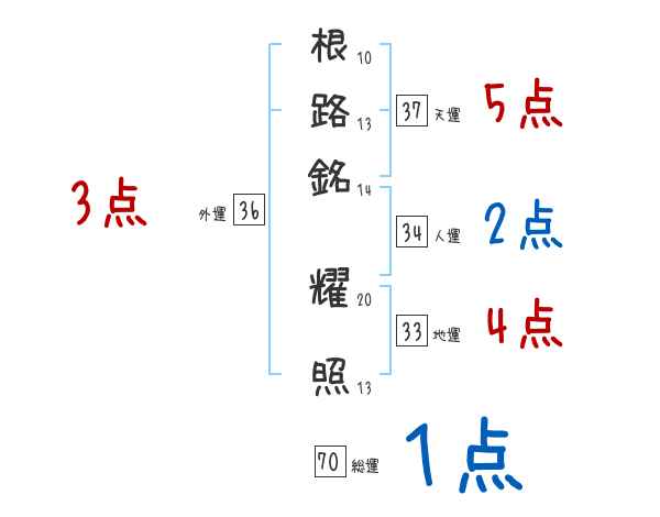 外運![]() | 根路銘耀照さんの外運は36画の3つ星!先見性が豊かです。多少神経質で苦労することも。 生活面を象徴する運勢です。外部から受ける影響力を表し、結婚運、家庭運や職場、環境への順応性を表します。 |