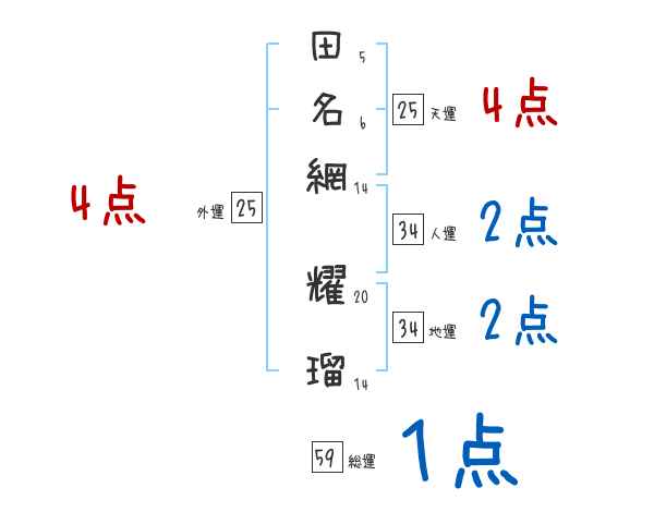 天運![]() | 田名網耀瑠さんの天運は25画の4つ星!個性があり才能があふれる。強運の持ち主で発展する。 家系が持つ宿命的な運勢を表します。祖先から受け継いだ苗字ですので自分の力が及びません。家柄を象徴します。 |