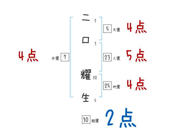 天運![]() | 二口耀生さんの天運は5画の4つ星!健康で安泰。協調性に優れ、財産に恵まれる。 家系が持つ宿命的な運勢を表します。祖先から受け継いだ苗字ですので自分の力が及びません。家柄を象徴します。 |