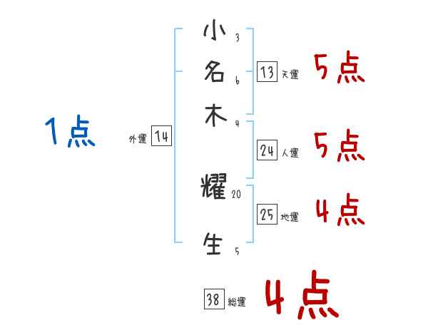 外運![]() | 小名木耀生さんの外運は14画の1つ星!人に対して優しいがストレスを溜め込みがち。人間関係のトラブルを避けるよう気をつけましょう。 生活面を象徴する運勢です。外部から受ける影響力を表し、結婚運、家庭運や職場、環境への順応性を表します。 |