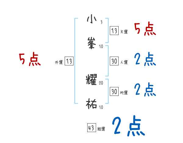 総運![]() | 小峯耀祐さんの総運は43画の2つ星!頑固な性格で独立心が強いかも。やや非現実的で浪費に注意しましょう。 あなたの人生を表す1番重要な運勢です。生涯を通じて影響する総合運となり、主に50歳以降の晩年期に影響を及ぼします。 |