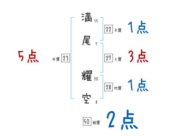 天運![]() | 満尾耀空さんの天運は22画の1つ星!努力することが苦手ないっぽう手先が器用。芸術性にも優れる。 家系が持つ宿命的な運勢を表します。祖先から受け継いだ苗字ですので自分の力が及びません。家柄を象徴します。 |