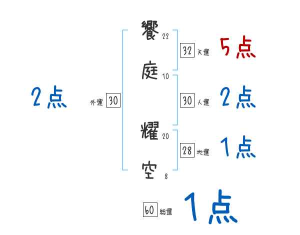天運![]() | 饗庭耀空さんの天運は32画の5つ星!柔軟性があり成功する。チャンスが多く金運が良い。 家系が持つ宿命的な運勢を表します。祖先から受け継いだ苗字ですので自分の力が及びません。家柄を象徴します。 |
