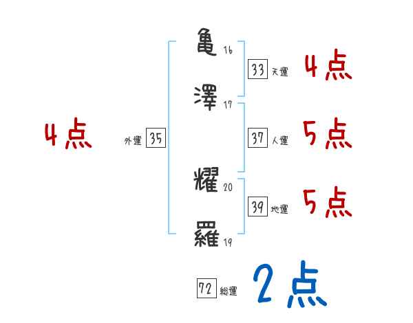外運![]() | 亀澤耀羅さんの外運は35画の4つ星!温厚な性格で感受性が高い。穏和な性格で人望が厚い。 生活面を象徴する運勢です。外部から受ける影響力を表し、結婚運、家庭運や職場、環境への順応性を表します。 |