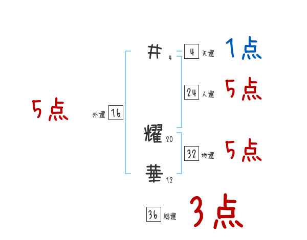 総運![]() | 井耀華さんの総運は36画の3つ星!先見性が豊かです。多少神経質で苦労することも。 あなたの人生を表す1番重要な運勢です。生涯を通じて影響する総合運となり、主に50歳以降の晩年期に影響を及ぼします。 |