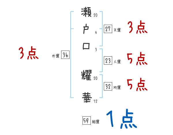 外運![]() | 瀬戸口耀華さんの外運は36画の3つ星!先見性が豊かです。多少神経質で苦労することも。 生活面を象徴する運勢です。外部から受ける影響力を表し、結婚運、家庭運や職場、環境への順応性を表します。 |