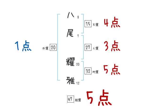 総運![]() | 八尾耀雅さんの総運は47画の5つ星!実力が開花し発展する円満な人生。財に恵まれる。 あなたの人生を表す1番重要な運勢です。生涯を通じて影響する総合運となり、主に50歳以降の晩年期に影響を及ぼします。 |