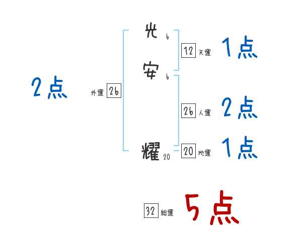 総運![]() | 光安耀さんの総運は32画の5つ星!柔軟性があり成功する。チャンスが多く金運が良い。 あなたの人生を表す1番重要な運勢です。生涯を通じて影響する総合運となり、主に50歳以降の晩年期に影響を及ぼします。 |