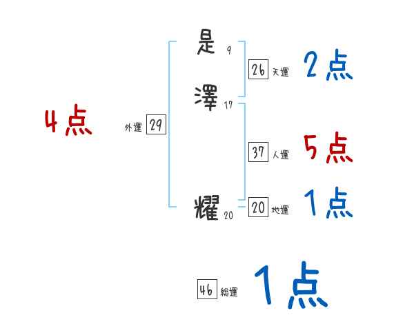 天運![]() | 是澤耀さんの天運は26画の2つ星!波瀾万丈かも。信頼できる人を大事にしましょう。 家系が持つ宿命的な運勢を表します。祖先から受け継いだ苗字ですので自分の力が及びません。家柄を象徴します。 |