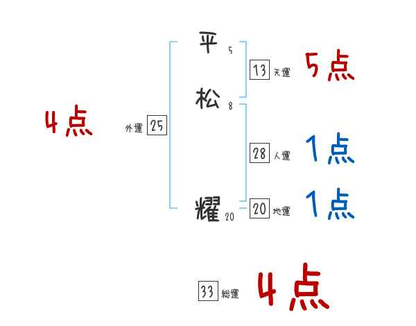 天運![]() | 平松耀さんの天運は13画の5つ星!才能に恵まれ人気がある。名声を手に入れる。円満な人生。 家系が持つ宿命的な運勢を表します。祖先から受け継いだ苗字ですので自分の力が及びません。家柄を象徴します。 |