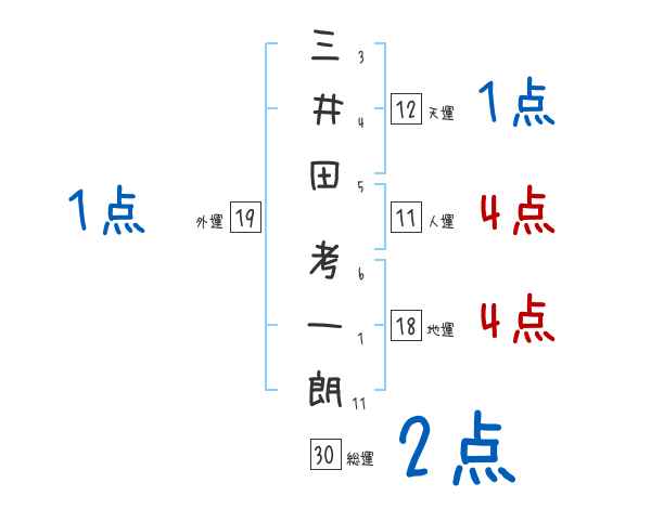 天運![]() | 三井田考一朗さんの天運は12画の1つ星!簡単な失敗で諦めてしまいやすいかも。着実に行動すると良いでしょう。 家系が持つ宿命的な運勢を表します。祖先から受け継いだ苗字ですので自分の力が及びません。家柄を象徴します。 |