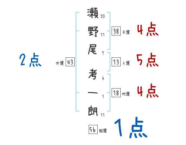 総運![]() | 瀬野尾考一朗さんの総運は56画の1つ星!消極的で無気力になりがち。誠実な気持ちが必要でしょう。 あなたの人生を表す1番重要な運勢です。生涯を通じて影響する総合運となり、主に50歳以降の晩年期に影響を及ぼします。 |