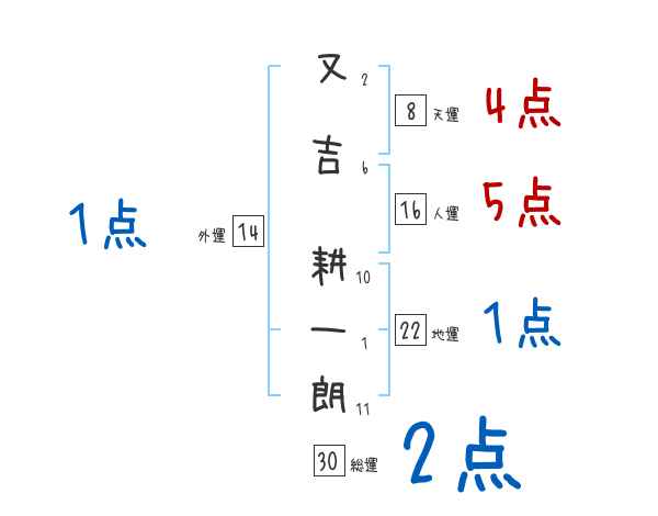 総運![]() | 又吉耕一朗さんの総運は30画の2つ星!浮き沈みの激しさに注意しましょう。 あなたの人生を表す1番重要な運勢です。生涯を通じて影響する総合運となり、主に50歳以降の晩年期に影響を及ぼします。 |