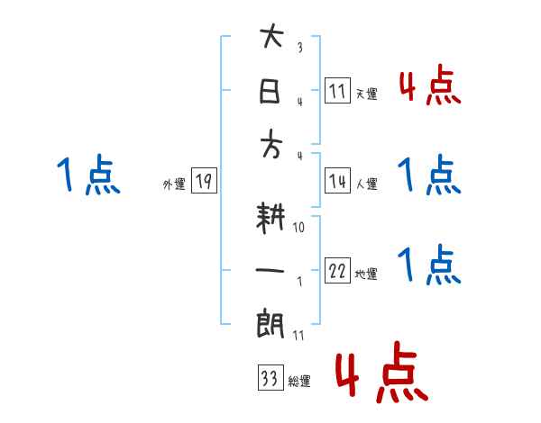 天運![]() | 大日方耕一朗さんの天運は11画の4つ星!着実に富や地位を得る幸運な人生。 家系が持つ宿命的な運勢を表します。祖先から受け継いだ苗字ですので自分の力が及びません。家柄を象徴します。 |