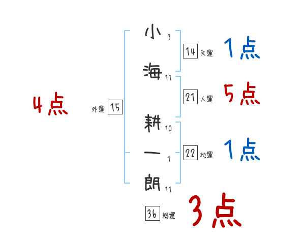 総運![]() | 小海耕一朗さんの総運は36画の3つ星!先見性が豊かです。多少神経質で苦労することも。 あなたの人生を表す1番重要な運勢です。生涯を通じて影響する総合運となり、主に50歳以降の晩年期に影響を及ぼします。 |