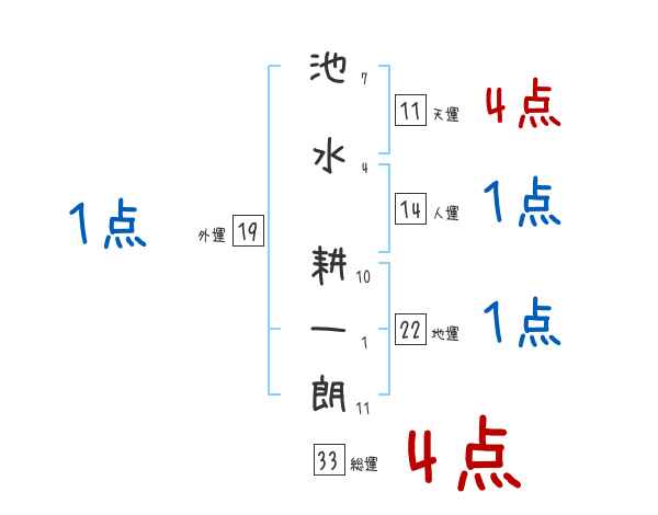 天運![]() | 池水耕一朗さんの天運は11画の4つ星!着実に富や地位を得る幸運な人生。 家系が持つ宿命的な運勢を表します。祖先から受け継いだ苗字ですので自分の力が及びません。家柄を象徴します。 |