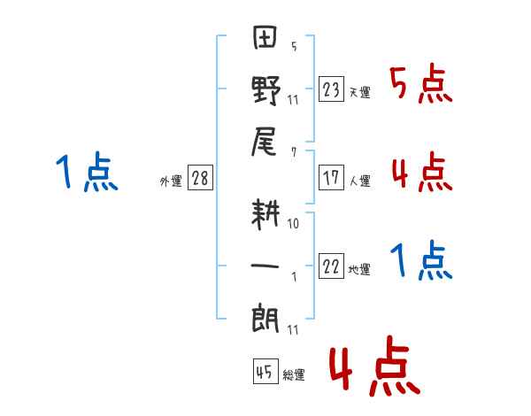 総運![]() | 田野尾耕一朗さんの総運は45画の4つ星!もくもくと物事を進め達成する。地味な努力家。 あなたの人生を表す1番重要な運勢です。生涯を通じて影響する総合運となり、主に50歳以降の晩年期に影響を及ぼします。 |