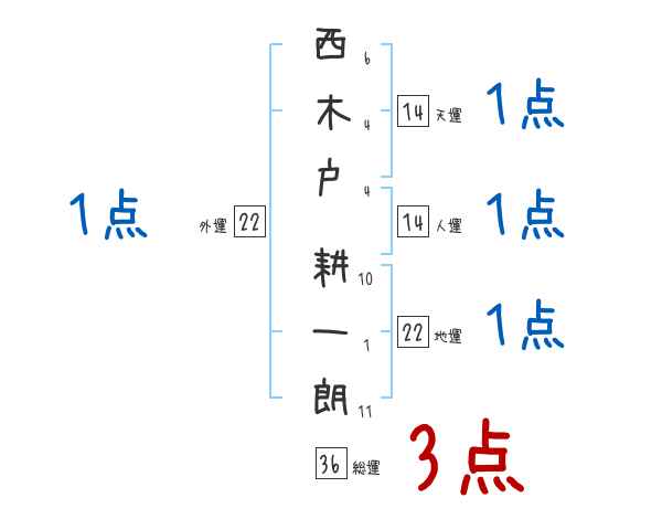 総運![]() | 西木戸耕一朗さんの総運は36画の3つ星!先見性が豊かです。多少神経質で苦労することも。 あなたの人生を表す1番重要な運勢です。生涯を通じて影響する総合運となり、主に50歳以降の晩年期に影響を及ぼします。 |
