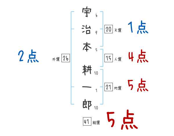 地運![]() | 宇治本耕一郎さんの地運は21画の5つ星!統率力がある。独立し成功する。名誉を手に入れる。 個性を表す基礎的な運勢です。性格形成や対人関係、行動力など家庭環境に影響されます。主に誕生してから20歳くらいまでの若年期の運勢を表します。 |