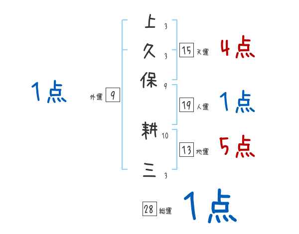 総運![]() | 上久保耕三さんの総運は28画の1つ星!家庭環境に注意。スポーツで活躍できる能力があるかも。 あなたの人生を表す1番重要な運勢です。生涯を通じて影響する総合運となり、主に50歳以降の晩年期に影響を及ぼします。 |