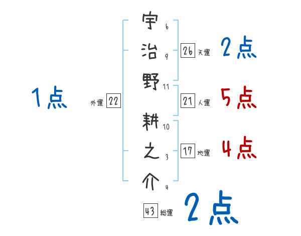 天運![]() | 宇治野耕之介さんの天運は26画の2つ星!波瀾万丈かも。信頼できる人を大事にしましょう。 家系が持つ宿命的な運勢を表します。祖先から受け継いだ苗字ですので自分の力が及びません。家柄を象徴します。 |