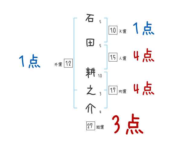 天運![]() | 石田耕之介さんの天運は10画の1つ星!不安を感じやすい傾向。ストレスを抱えないように注意しましょう。 家系が持つ宿命的な運勢を表します。祖先から受け継いだ苗字ですので自分の力が及びません。家柄を象徴します。 |