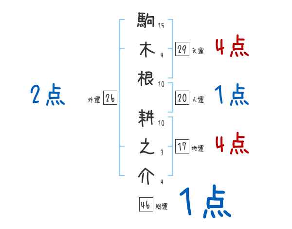 外運![]() | 駒木根耕之介さんの外運は26画の2つ星!波瀾万丈かも。信頼できる人を大事にしましょう。 生活面を象徴する運勢です。外部から受ける影響力を表し、結婚運、家庭運や職場、環境への順応性を表します。 |