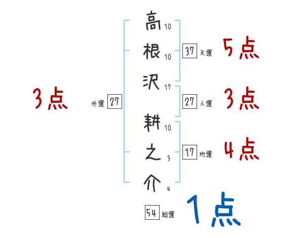 総運![]() | 高根沢耕之介さんの総運は54画の1つ星!トラブルが多いかも。周りをよく見て協調して過ごしましょう。 あなたの人生を表す1番重要な運勢です。生涯を通じて影響する総合運となり、主に50歳以降の晩年期に影響を及ぼします。 |