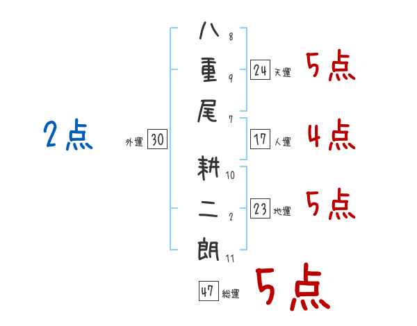 八重尾耕二朗さんの画数の鑑定結果