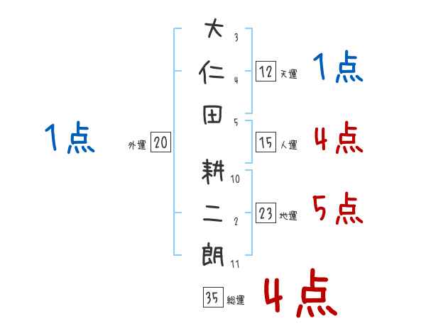 天運![]() | 大仁田耕二朗さんの天運は12画の1つ星!簡単な失敗で諦めてしまいやすいかも。着実に行動すると良いでしょう。 家系が持つ宿命的な運勢を表します。祖先から受け継いだ苗字ですので自分の力が及びません。家柄を象徴します。 |