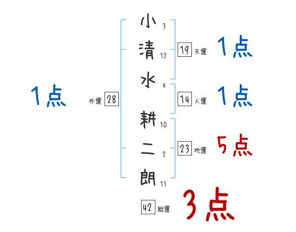 天運![]() | 小清水耕二朗さんの天運は19画の1つ星!優れた才能を持ちますが、協調性が足りないことも。周りの人と協力する事を意識しましょう。 家系が持つ宿命的な運勢を表します。祖先から受け継いだ苗字ですので自分の力が及びません。家柄を象徴します。 |