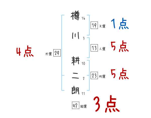 総運![]() | 樽川耕二朗さんの総運は42画の3つ星!病気に注意。多芸であるが消極的でおとなしい。 あなたの人生を表す1番重要な運勢です。生涯を通じて影響する総合運となり、主に50歳以降の晩年期に影響を及ぼします。 |