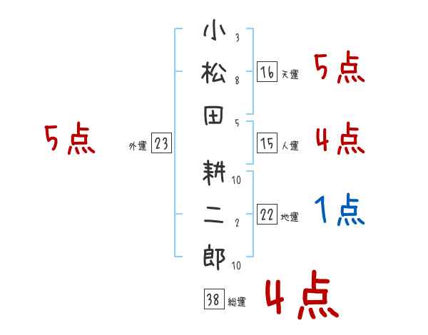 外運![]() | 小松田耕二郎さんの外運は23画の5つ星!想像力に優れ活力がある。一代で成功し名誉を手に入れる。 生活面を象徴する運勢です。外部から受ける影響力を表し、結婚運、家庭運や職場、環境への順応性を表します。 |