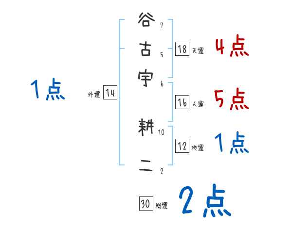 総運![]() | 谷古宇耕二さんの総運は30画の2つ星!浮き沈みの激しさに注意しましょう。 あなたの人生を表す1番重要な運勢です。生涯を通じて影響する総合運となり、主に50歳以降の晩年期に影響を及ぼします。 |