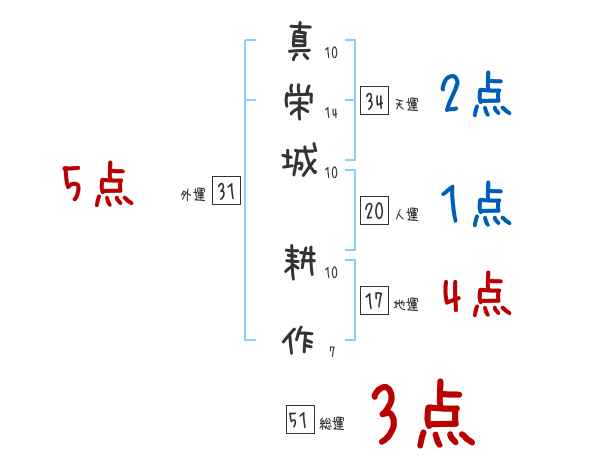 総運![]() | 真栄城耕作さんの総運は51画の3つ星!変化が激しく、危険に注意。堅実な性格。 あなたの人生を表す1番重要な運勢です。生涯を通じて影響する総合運となり、主に50歳以降の晩年期に影響を及ぼします。 |