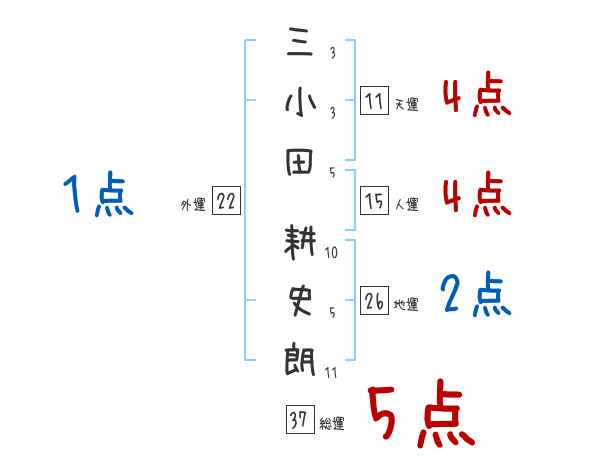天運![]() | 三小田耕史朗さんの天運は11画の4つ星!着実に富や地位を得る幸運な人生。 家系が持つ宿命的な運勢を表します。祖先から受け継いだ苗字ですので自分の力が及びません。家柄を象徴します。 |