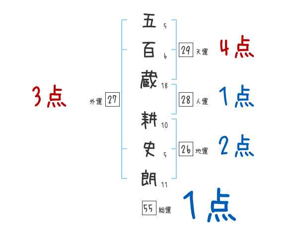 天運![]() | 五百蔵耕史朗さんの天運は29画の4つ星!完全主義で才能がある。厳格な心の持ち主。 家系が持つ宿命的な運勢を表します。祖先から受け継いだ苗字ですので自分の力が及びません。家柄を象徴します。 |