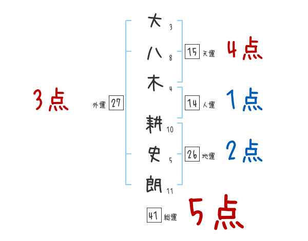 外運![]() | 大八木耕史朗さんの外運は27画の3つ星!頭脳明晰だが強情で摩擦が多い傾向。孤立に注意。 生活面を象徴する運勢です。外部から受ける影響力を表し、結婚運、家庭運や職場、環境への順応性を表します。 |
