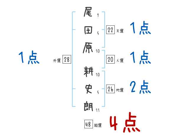外運![]() | 尾田原耕史朗さんの外運は28画の1つ星!家庭環境に注意。スポーツで活躍できる能力があるかも。 生活面を象徴する運勢です。外部から受ける影響力を表し、結婚運、家庭運や職場、環境への順応性を表します。 |