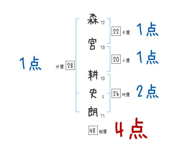 天運![]() | 森宮耕史朗さんの天運は22画の1つ星!努力することが苦手ないっぽう手先が器用。芸術性にも優れる。 家系が持つ宿命的な運勢を表します。祖先から受け継いだ苗字ですので自分の力が及びません。家柄を象徴します。 |