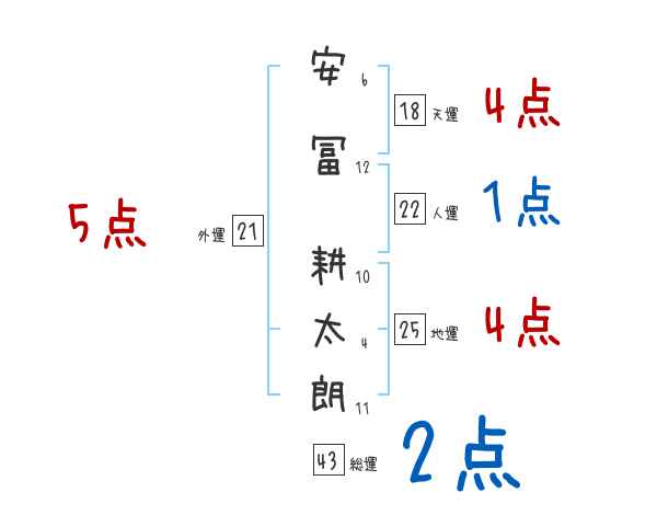 天運![]() | 安冨耕太朗さんの天運は18画の4つ星!情熱的で剛気。忍耐力があり信頼される。 家系が持つ宿命的な運勢を表します。祖先から受け継いだ苗字ですので自分の力が及びません。家柄を象徴します。 |