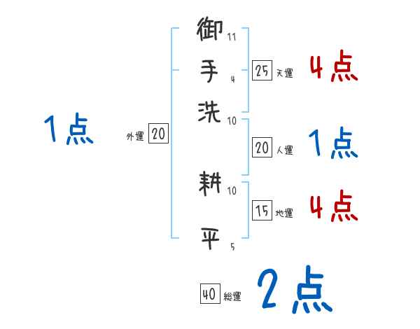 天運![]() | 御手洗耕平さんの天運は25画の4つ星!個性があり才能があふれる。強運の持ち主で発展する。 家系が持つ宿命的な運勢を表します。祖先から受け継いだ苗字ですので自分の力が及びません。家柄を象徴します。 |