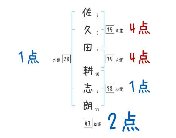 天運![]() | 佐久田耕志朗さんの天運は15画の4つ星!人徳があり出世する。順調に物事を進め円満な人生。 家系が持つ宿命的な運勢を表します。祖先から受け継いだ苗字ですので自分の力が及びません。家柄を象徴します。 |