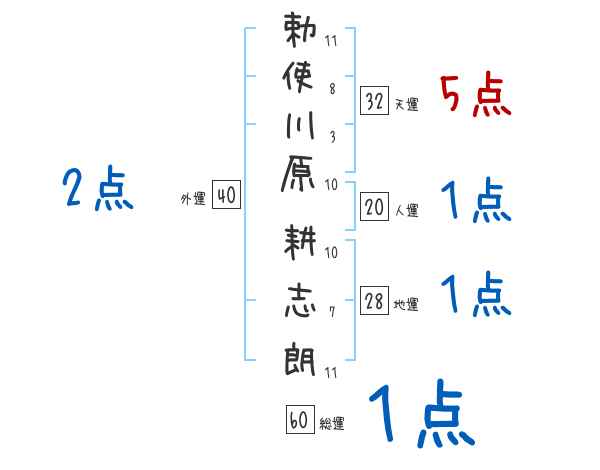 天運![]() | 勅使川原耕志朗さんの天運は32画の5つ星!柔軟性があり成功する。チャンスが多く金運が良い。 家系が持つ宿命的な運勢を表します。祖先から受け継いだ苗字ですので自分の力が及びません。家柄を象徴します。 |
