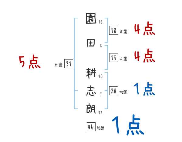 天運![]() | 園田耕志朗さんの天運は18画の4つ星!情熱的で剛気。忍耐力があり信頼される。 家系が持つ宿命的な運勢を表します。祖先から受け継いだ苗字ですので自分の力が及びません。家柄を象徴します。 |