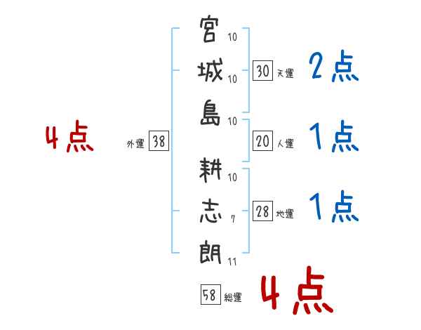 外運![]() | 宮城島耕志朗さんの外運は38画の4つ星!温厚な性格で技術的な才能を発揮する。職人的な仕事に向いている。 生活面を象徴する運勢です。外部から受ける影響力を表し、結婚運、家庭運や職場、環境への順応性を表します。 |
