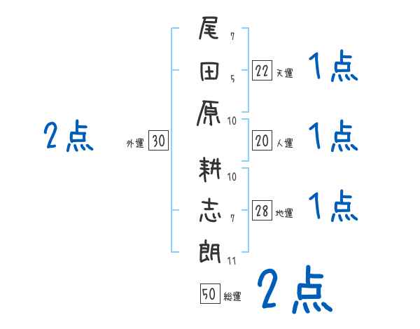 天運![]() | 尾田原耕志朗さんの天運は22画の1つ星!努力することが苦手ないっぽう手先が器用。芸術性にも優れる。 家系が持つ宿命的な運勢を表します。祖先から受け継いだ苗字ですので自分の力が及びません。家柄を象徴します。 |