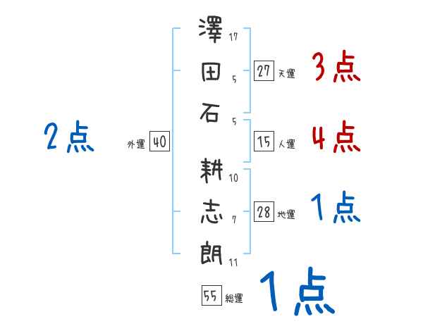 外運![]() | 澤田石耕志朗さんの外運は40画の2つ星!自信過剰で物事に固執するためトラブルに注意。 生活面を象徴する運勢です。外部から受ける影響力を表し、結婚運、家庭運や職場、環境への順応性を表します。 |