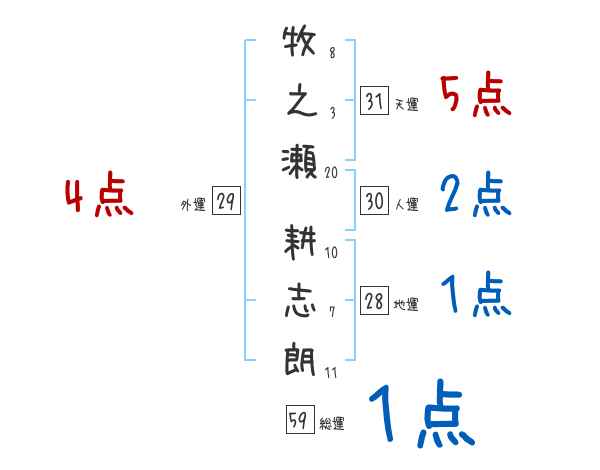 外運![]() | 牧之瀬耕志朗さんの外運は29画の4つ星!完全主義で才能がある。厳格な心の持ち主。 生活面を象徴する運勢です。外部から受ける影響力を表し、結婚運、家庭運や職場、環境への順応性を表します。 |