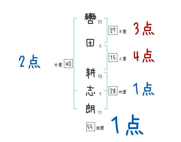外運![]() | 轡田耕志朗さんの外運は40画の2つ星!自信過剰で物事に固執するためトラブルに注意。 生活面を象徴する運勢です。外部から受ける影響力を表し、結婚運、家庭運や職場、環境への順応性を表します。 |